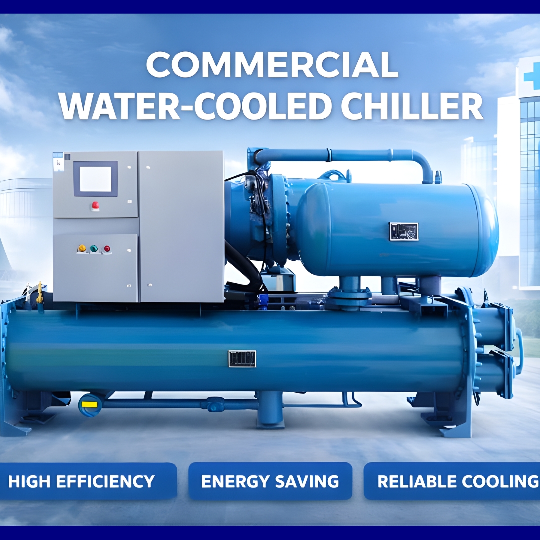 Commercial water-cooled chillers provide high-performance, energy-efficient cooling for big buildings and industrial applications. Because they transport heat through water and cooling towers, they provide steady performance, lower operating costs, and dependable temperature management, making them perfect for hospitals, data centers, and heavy-duty institutions.